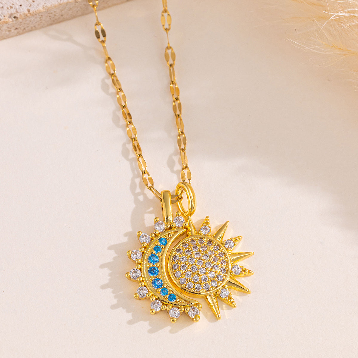 Celestia is an elegant necklace crafted from durable stainless steel, featuring a harmonious design of the moon and sun. This piece combines celestial symbolism with timeless sophistication, making it a refined accessory for any occasion. Its polished finish ensures lasting shine, while the balanced motifs evoke a sense of harmony and grace. Perfect for those who appreciate subtle yet meaningful jewelry.