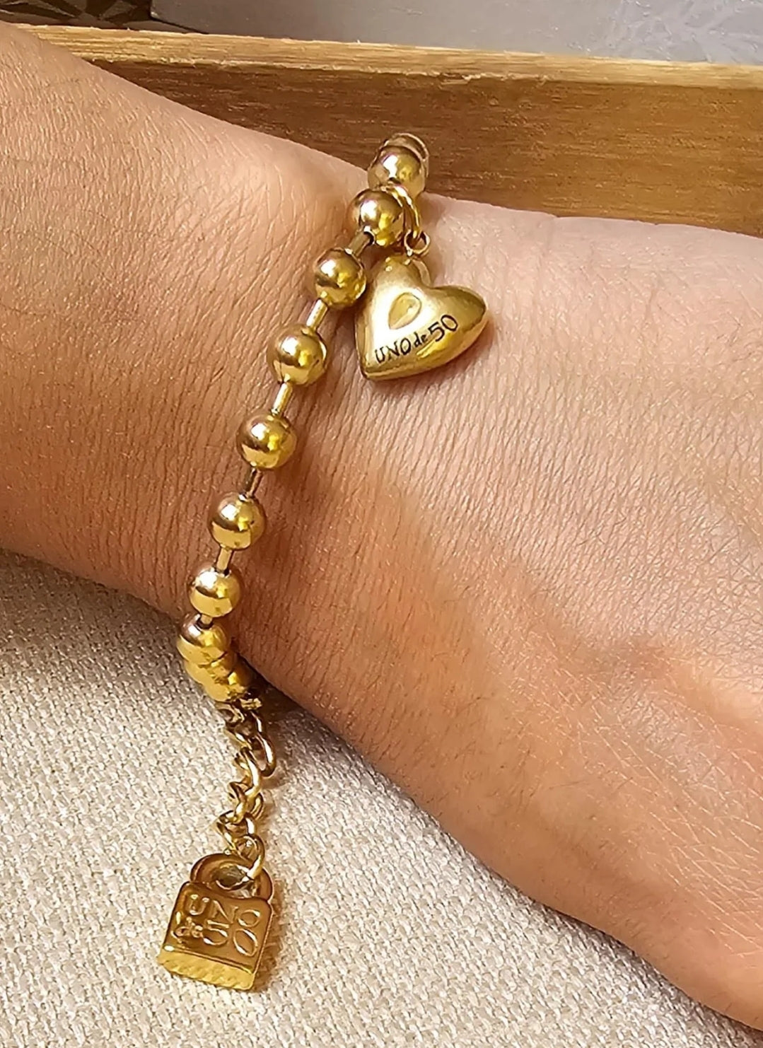 Indulge in the ultimate luxury with our UNO de 50 Small Heart Charm Bracelet. Featuring a delicate and intricate design, this bracelet is a timeless piece to add to your collection. Made by the exclusive brand UNO de 50, this bracelet is an expression of style and sophistication. Elevate any outfit with this stunning and unique accessory.